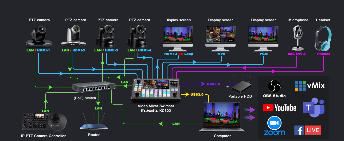 | Protocols | NDI, TCP/IP, HTTP, RTSP, RTMP/RTMPS, ONVIF, DHCP, SRT, Multicast |