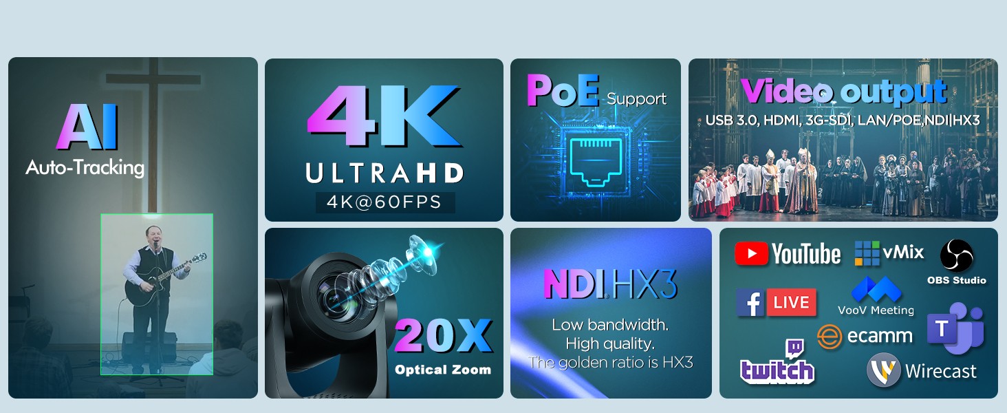 | Network Protocols | HTTP,RTSP, RTMP, ONVIF, STR, GB28181;Support Multicast; VISCA over IP; NDI HX2/HX3 (optional) (100Mbps Ethernet, supports PoE+, supports remote upgrade/remote reboot/remote reset) |