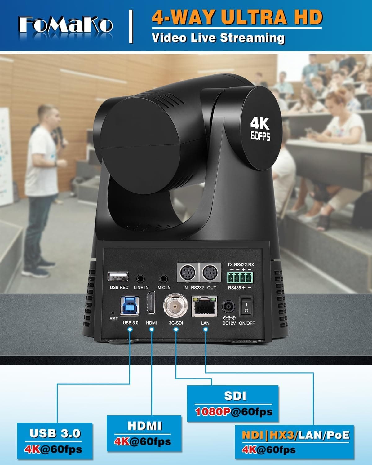 | Video Interfaces | HDMI, 3G-SDI, LAN(POE+), USB3.0, USB REC, LINE IN, MIC IN, RS232-IN, RS232- OUT, RS422(compatible with RS485), DC12V Power Supply, Power Switch |