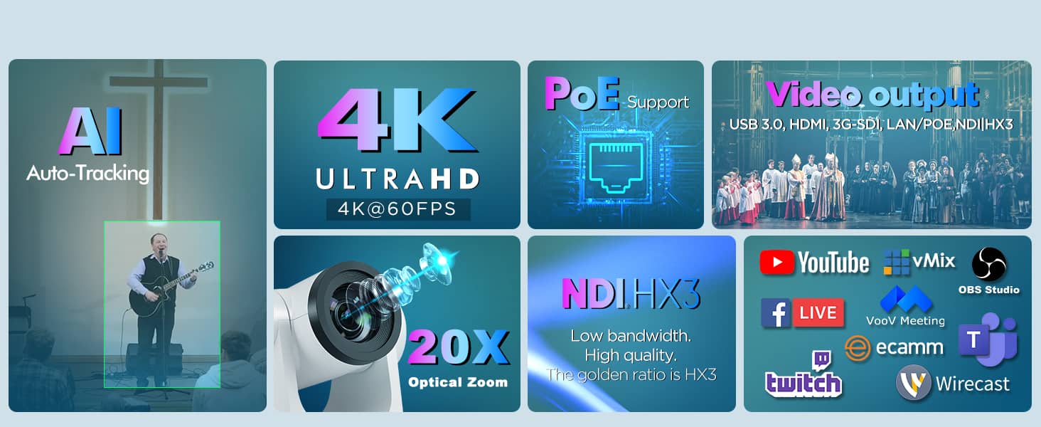 | Network Protocols | HTTP,RTSP, RTMP, ONVIF, STR, GB28181;Support Multicast; VISCA over IP; NDI HX2/HX3 (optional) (100Mbps Ethernet, supports PoE+, supports remote upgrade/remote reboot/remote reset) |